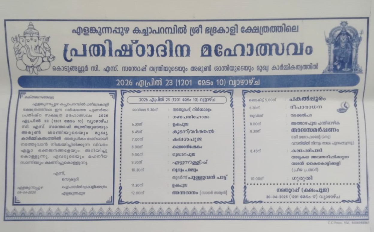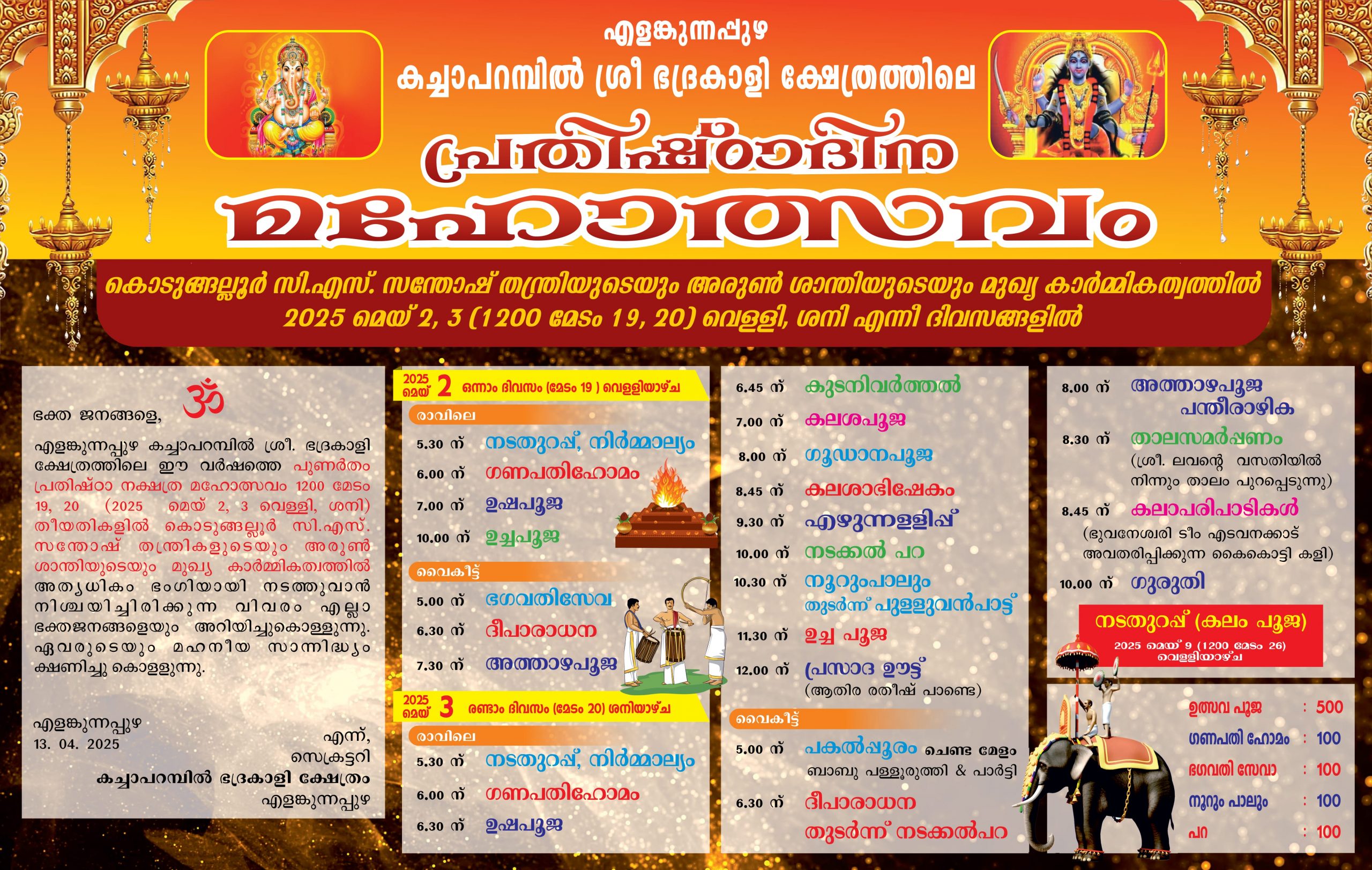 The Kachaparambil Bhadra Kali temple is not just a place of worship but also a symbol of cultural heritage and tradition. The temple is a testament to the rich history and culture of Kerala and the strong beliefs and devotion of its people towards their deities.